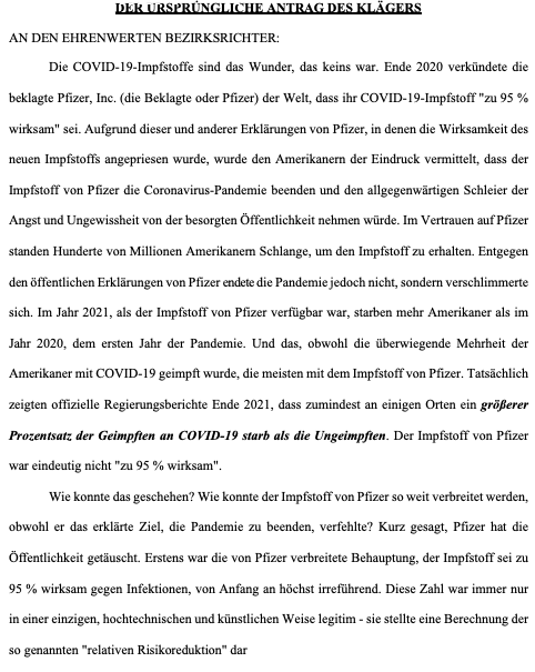 Thema heute: „Anklageschrift von Ken Paxton, Generalbundesanwalt des States Texas, USA gegen die Pfizer Inc.“ Eine Deepl -Übersetzung Folge 1-der Text wird vollständig in den Anhängen abgebildet. „ANTRAG DES KLÄGERS AN DEN EHRENWERTEN BEZIRKSRICHTER: Die COVID-19-Impfstoffe sind das Wunder, das keins war. Ende 2020 verkündete die beklagte Pfizer, Inc. (die Beklagte oder Pfizer) der Welt, dass ihr COVID-19-Impfstoff „zu 95 % wirksam“ sei. Aufgrund dieser und anderer Erklärungen von Pfizer, in denen die Wirksamkeit des neuen Impfstoffs angepriesen wurde, wurde den Amerikanern der Eindruck vermittelt, dass der Impfstoff von Pfizer die Coronavirus-Pandemie beenden und den allgegenwärtigen Schleier der Angst und Ungewissheit von der besorgten Öffentlichkeit nehmen würde. Im Vertrauen auf Pfizer standen Hunderte von Millionen Amerikanern Schlange, um den Impfstoff zu erhalten. Entgegen den öffentlichen Erklärungen von Pfizer endete die Pandemie jedoch nicht, sondern verschlimmerte sich. Im Jahr 2021, als der Impfstoff von Pfizer verfügbar war, starben mehr Amerikaner als im Jahr 2020, dem ersten Jahr der Pandemie. Und das, obwohl die überwiegende Mehrheit der Amerikaner mit COVID-19 geimpft wurde, die meisten mit dem Impfstoff von Pfizer. Tatsächlich zeigten offizielle Regierungsberichte Ende 2021, dass zumindest an einigen Orten ein größerer Prozentsatz der Geimpften an COVID-19 starb als die Ungeimpften. Der Impfstoff von Pfizer war eindeutig nicht „zu 95 % wirksam“. Wie konnte das geschehen? Wie konnte der Impfstoff von Pfizer so weit verbreitet werden, obwohl er das erklärte Ziel, die Pandemie zu beenden, verfehlte? Kurz gesagt, Pfizer hat die Öffentlichkeit getäuscht. Erstens war die von Pfizer verbreitete Behauptung, der Impfstoff sei zu 95 % wirksam gegen Infektionen, von Anfang an höchst irreführend. Diese Zahl war immer nur in einer einzigen, hochtechnischen und künstlichen Weise legitim – sie stellte eine Berechnung der so genannten „relativen Risikoreduktion“ dar für geimpfte Personen in der damals noch nicht abgeschlossenen klinischen Zulassungsstudie von Pfizer. Aus den Veröffentlichungen der FDA geht jedoch hervor, dass die „relative Risikoreduzierung“ eine irreführende Statistik ist, die die Entscheidung der Verbraucher in unzulässiger Weise beeinflusst. In der Tat, so die FDA: „Wenn Informationen im Format des relativen Risikos präsentiert werden, erscheint die Risikoverringerung groß und die Behandlungen werden positiver bewertet als wenn dieselben Informationen mit genaueren Maßstäben präsentiert werden“. Hier liegt der Beweis in der Gemängelage. Während Pfizer seine Impfstoffe mit 95 % hochwirksam erscheinen ließ, sah die Wahrheit ganz anders aus. Als Pfizer begann, diese Behauptungen aufzustellen, verfügte das Unternehmen im Durchschnitt nur über zwei Monate klinischer Studiendaten, die einen Vergleich zwischen geimpften und ungeimpften Personen ermöglichten. Von 17.000 Placeboempfängern erkrankten in diesem Zeitraum nur 162 an COVID-19. Ausgehend von diesen Zahlen hatte der Impfstatus einen vernachlässigbaren Einfluss darauf, ob ein Studienteilnehmer an COVID-19 erkrankte. Das Risiko, sich mit COVID-19 zu infizieren, war in diesem kurzen Zeitfenster so gering, dass der Impfstoff von Pfizer das Infektionsrisiko einer Person nur geringfügig erhöhte. Und die absolute Risikoreduktion eines Impflings – die von der FDA (Food & Drug Administration) bevorzugte Kennzahl für die Wirksamkeit – zeigte, dass der Impfstoff nur zu 0,85 % wirksam war. Darüber hinaus mussten nach Angaben von Pfizer zur Verhinderung eines COVID-19-Falls 119 Personen geimpft werden. Das war die einfache Wahrheit. Doch die öffentliche Darstellung von Pfizer entsprach in keiner Weise der Realität. Nachdem Pfizer den Markt mit der irreführenden Angabe „95 % wirksam“ überschwemmt hatte, weitete das Unternehmen seine Täuschungskampagne an mehreren Fronten aus: •Erstens, die Dauer des Schutzes: Als die FDA den Impfstoff von Pfizer erstmals zuließ, erkannte sie an, dass es „nicht möglich“ sei zu wissen, wie lange der Impfstoff über zwei Monate hinaus wirksam bleiben würde. Doch Anfang 2021 erweckte Pfizer absichtlich den falschen Eindruck, dass sein Impfstoff einen dauerhaften und nachhaltigen Schutz biete, und ging dabei so weit, der Öffentlichkeit höchst relevante Daten und Informationen vorzuenthalten, die zeigen, dass die Wirksamkeit schnell nachlässt. •Zweitens: Übertragung: Die FDA warnte Pfizer, dass sie zusätzliche Informationen benötige, um festzustellen, ob der Impfstoff vor einer „Übertragung“ von COVID-19 zwischen Personen schütze. Doch Pfizer führte stattdessen eine Angstkampagne durch und nutzte die starken Ängste der Öffentlichkeit vor der einjährigen Pandemie aus, indem es behauptete, die Amerikaner müssten sich impfen lassen, um ihre Angehörigen vor einer Ansteckung mit COVID-19 zu schützen. •Drittens: Variantenschutz: Pfizer hat wissentlich falsche und nicht belegte Behauptungen über die Wirksamkeit des Impfstoffs gegen Varianten, insbesondere die so genannte Delta-Variante, aufgestellt. Der Impfstoff wirkte bemerkenswert schlecht gegen die Delta-Variante, und die eigenen Daten von Pfizer bestätigten diese Tatsache. Dennoch erklärte Pfizer der Öffentlichkeit, sein Impfstoff sei „sehr, sehr, sehr wirksam gegen Delta“. Das Produkt von Pfizer, das durch die Falschdarstellungen des Unternehmens begünstigt wurde, hat das Unternehmen enorm bereichert. Doch während sich die Falschdarstellungen von Pfizer häuften, stürzte die Leistung des Impfstoffs ab. Ab Ende 2020 stützten sich mehrere Länder bei ihren ersten Impfkampagnen stark auf den kürzlich zugelassenen Impfstoff von Pfizer. Dank der breiten öffentlichen Beteiligung stiegen die Impfraten sprunghaft an. Unter der Oberfläche des von Pfizer mit falschen Angaben angeheizten Erfolges zeigen jedoch unzählige Informationen